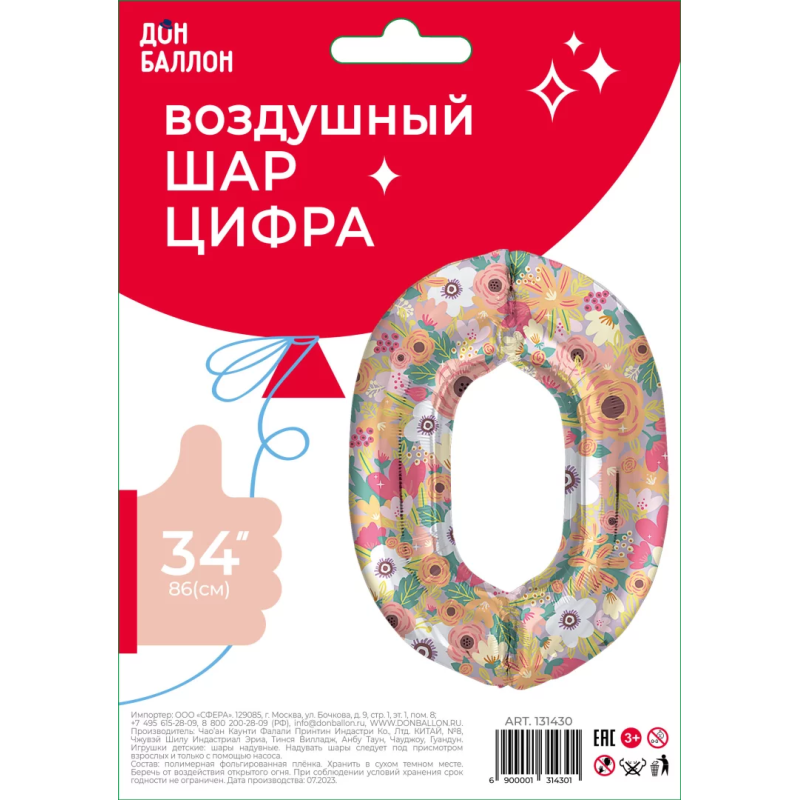 Шар (34''/86 см) Цифра, 0 Цветочный вальс, 1 шт. в уп., 131430