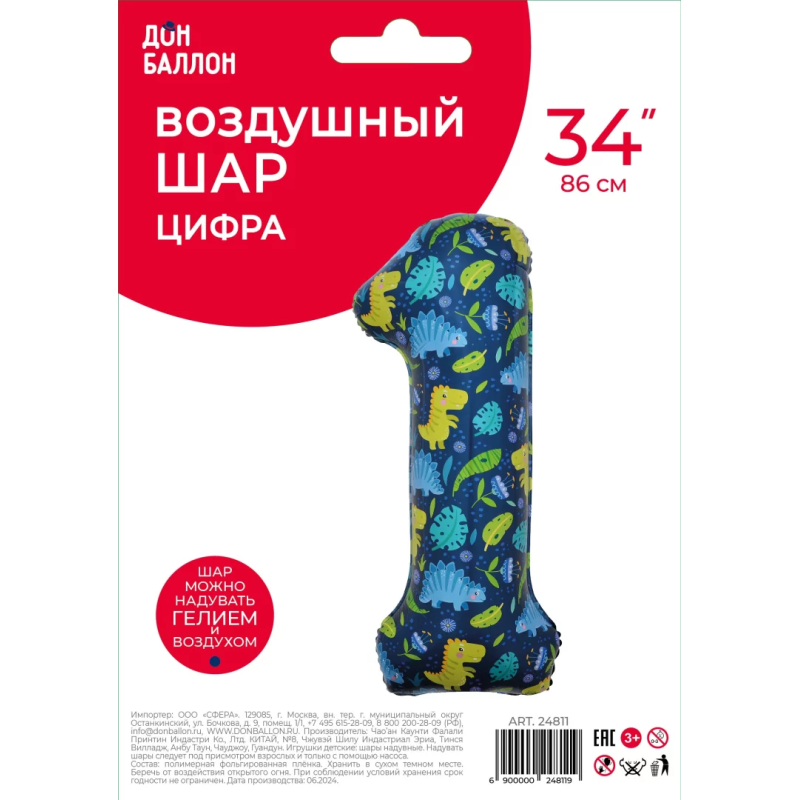 Шар (34''/86 см) Цифра, 1 Динозавры, 1 шт. в уп., 24811