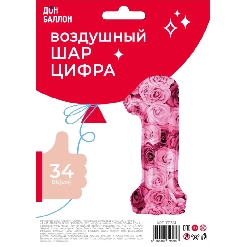 Шар (34''/86 см) Цифра, 1 Симфония роз, Фуше, 1 шт. в уп., 131361