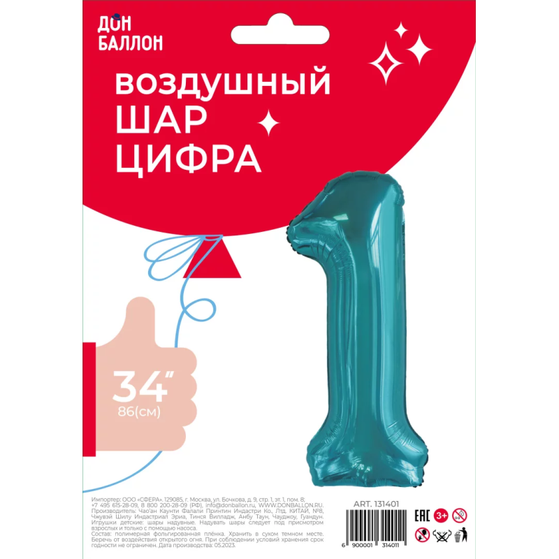 Шар (34''/86 см) Цифра, 1 Slim, Тиффани, 1 шт. в уп., 131401