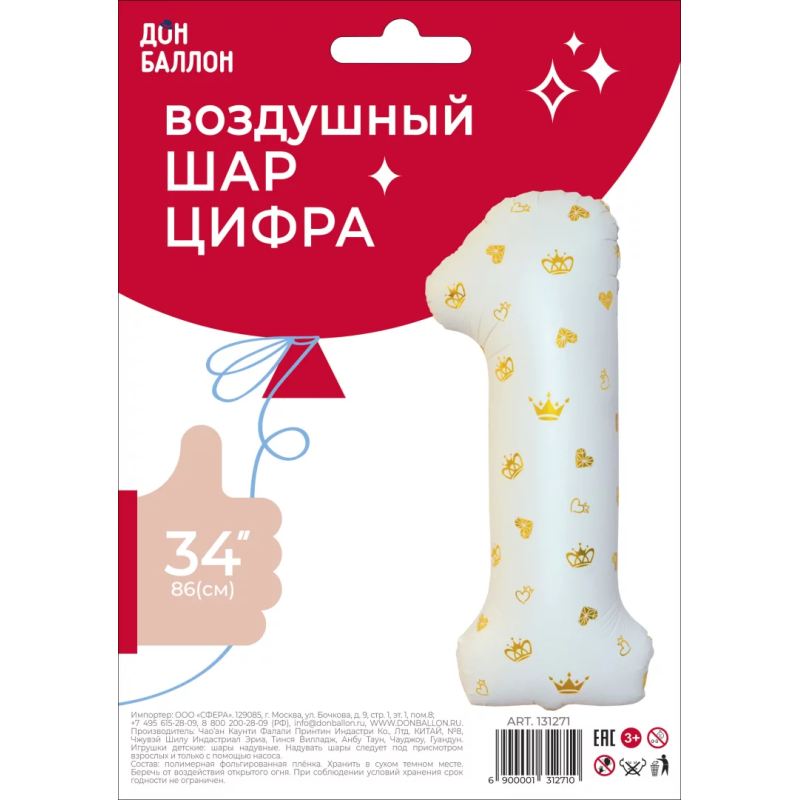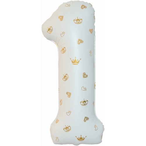 Шар (34''/86 см) Цифра, 1 Золотые короны, Белый, 1 шт. в уп., 131271