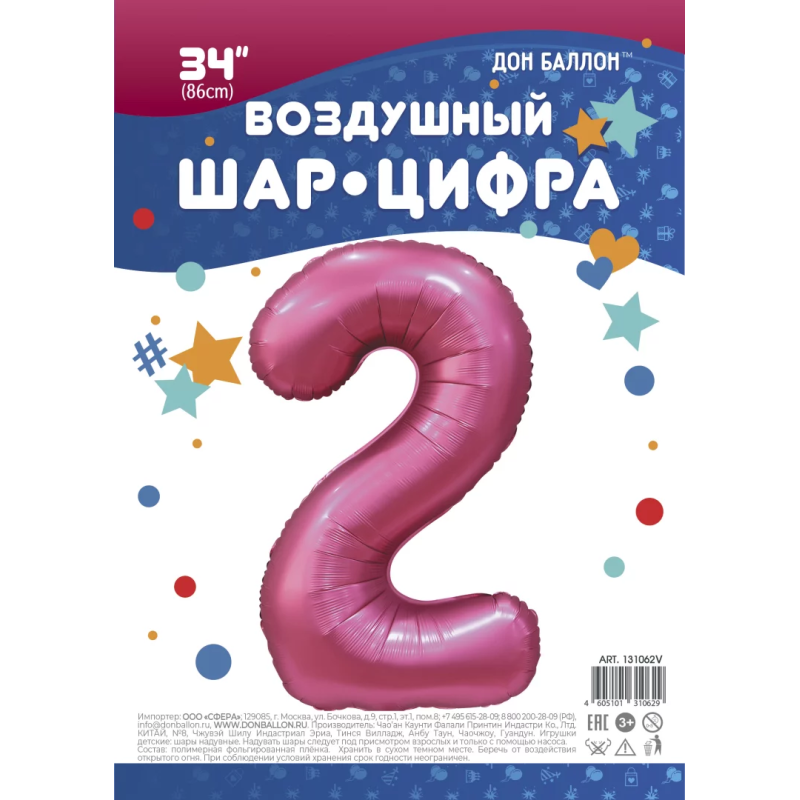 Шар (34''/86 см) Цифра, 2, Бордовый, Сатин, 1 шт. в уп., 131062V
