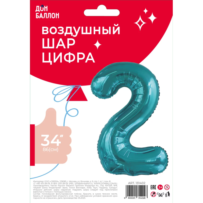 Шар (34''/86 см) Цифра, 2 Slim, Тиффани, 1 шт. в уп., 131402