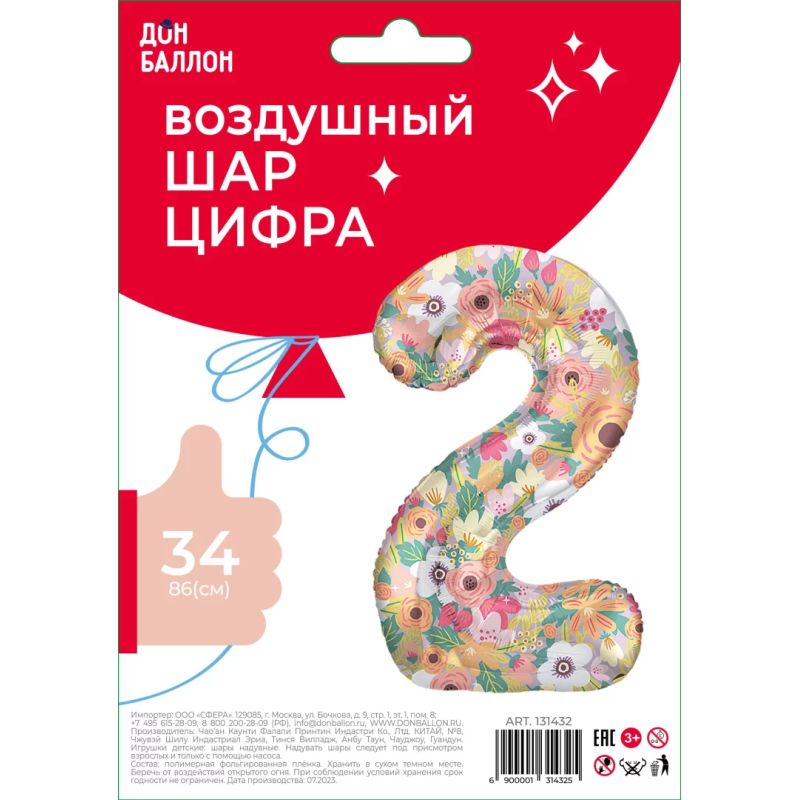 Шар (34''/86 см) Цифра, 2 Цветочный вальс, 1 шт. в уп., 131432