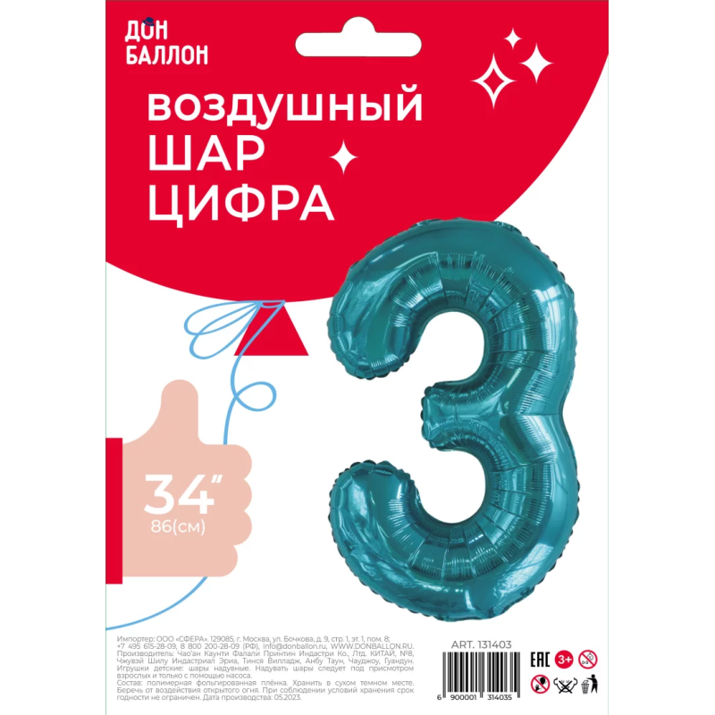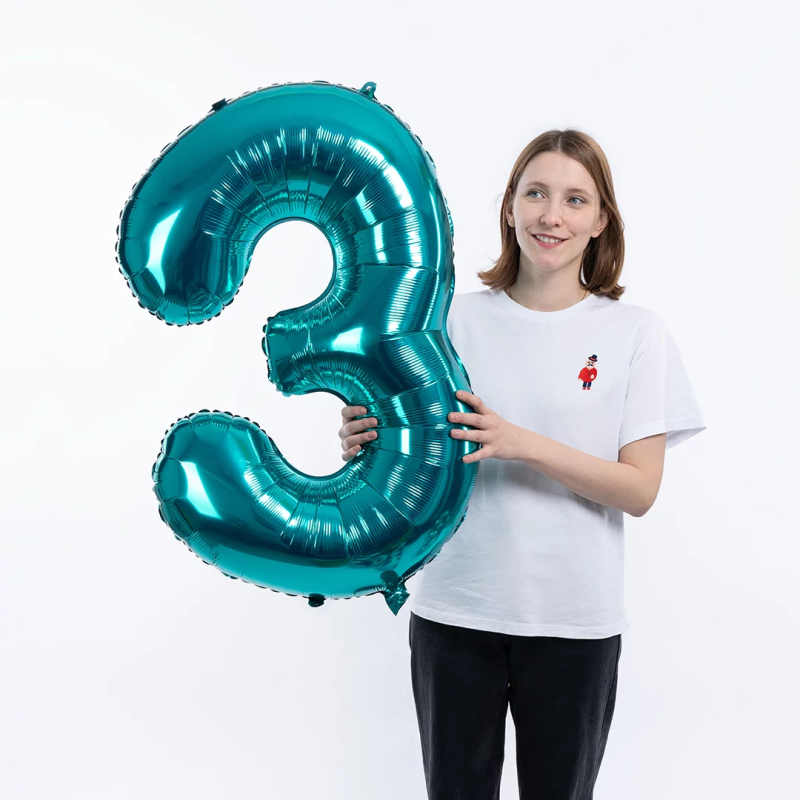 Шар (34''/86 см) Цифра, 3 Slim, Тиффани, 1 шт. в уп., 131403