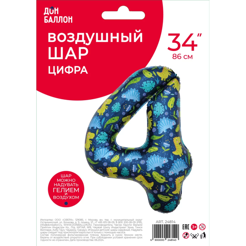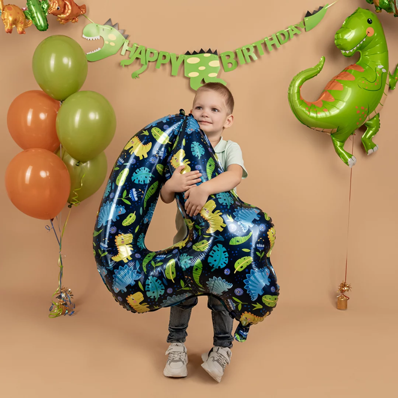 Шар (34''/86 см) Цифра, 4 Динозавры, 1 шт. в уп., 24814