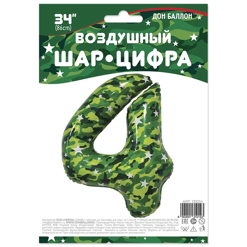 Шар (34''/86 см) Цифра, 4, Камуфляж, 1 шт. в уп., 131014