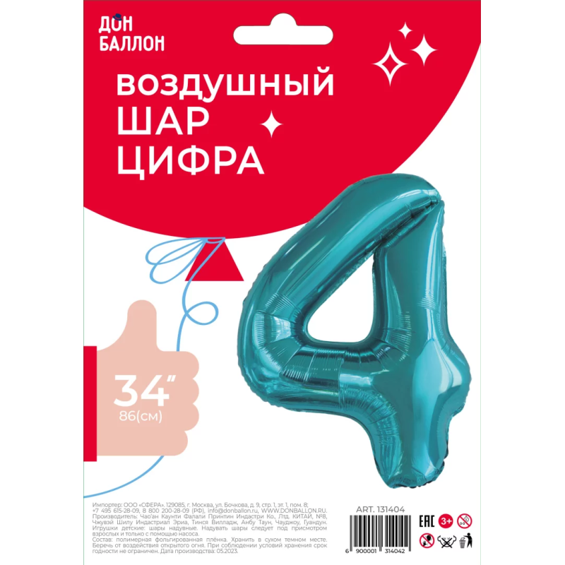 Шар (34''/86 см) Цифра, 4 Slim, Тиффани, 1 шт. в уп., 131404