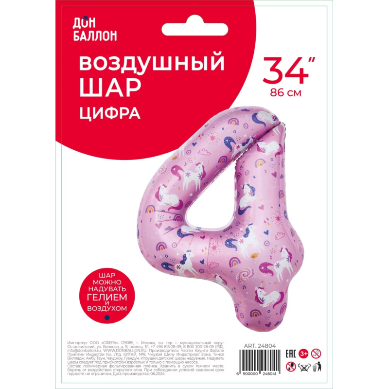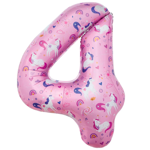 Шар (34''/86 см) Цифра, 4 Волшебные единороги, Розовый, 1 шт. в уп., 24804