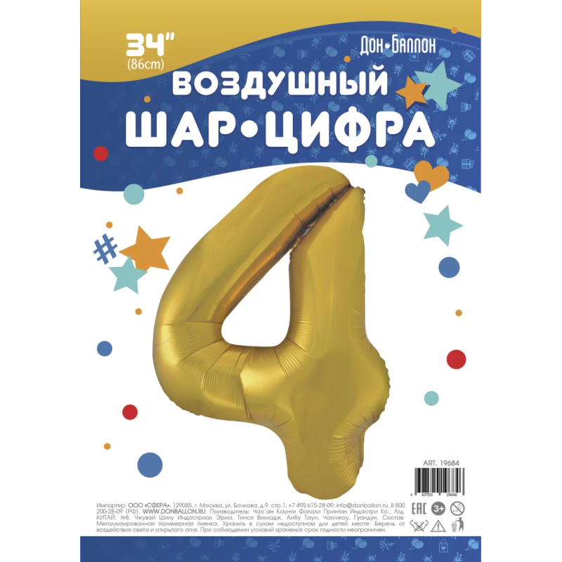 Шар (34''/86 см) Цифра, 4, Золото, 1 шт. в уп., 19684