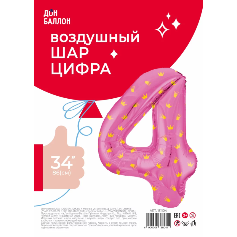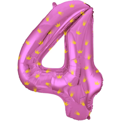 Шар (34''/86 см) Цифра, 4 Золотые короны, Розовый, 1 шт. в уп., 131104