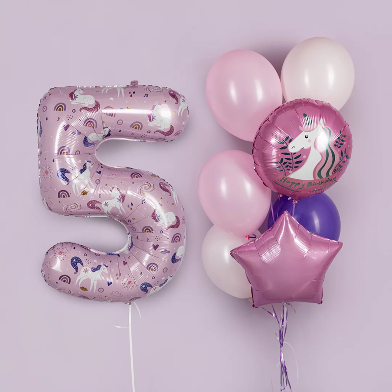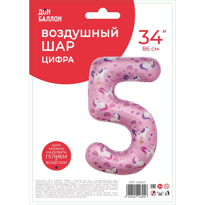 Шар (34''/86 см) Цифра, 5 Волшебные единороги, Розовый, 1 шт. в уп., 24805