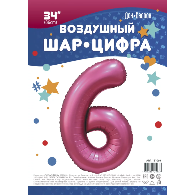 Шар (34''/86 см) Цифра, 6, Бордовый, Сатин, 1 шт. в уп., 131066V