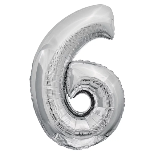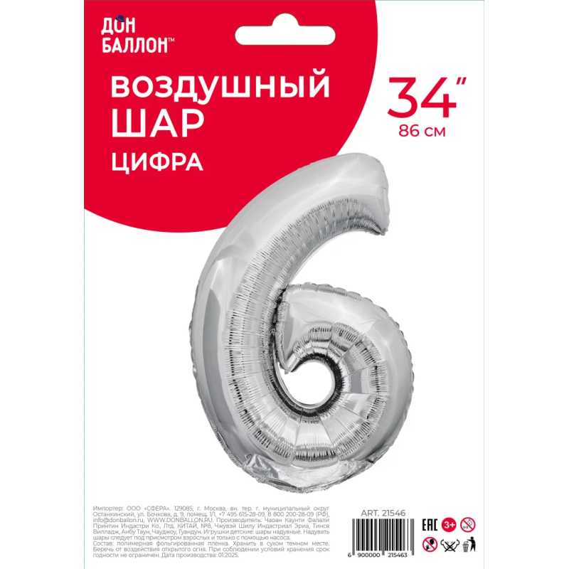 Шар (34''/86 см) Цифра, 6 ЭКО, Серебро, 1 шт. в уп., 21546