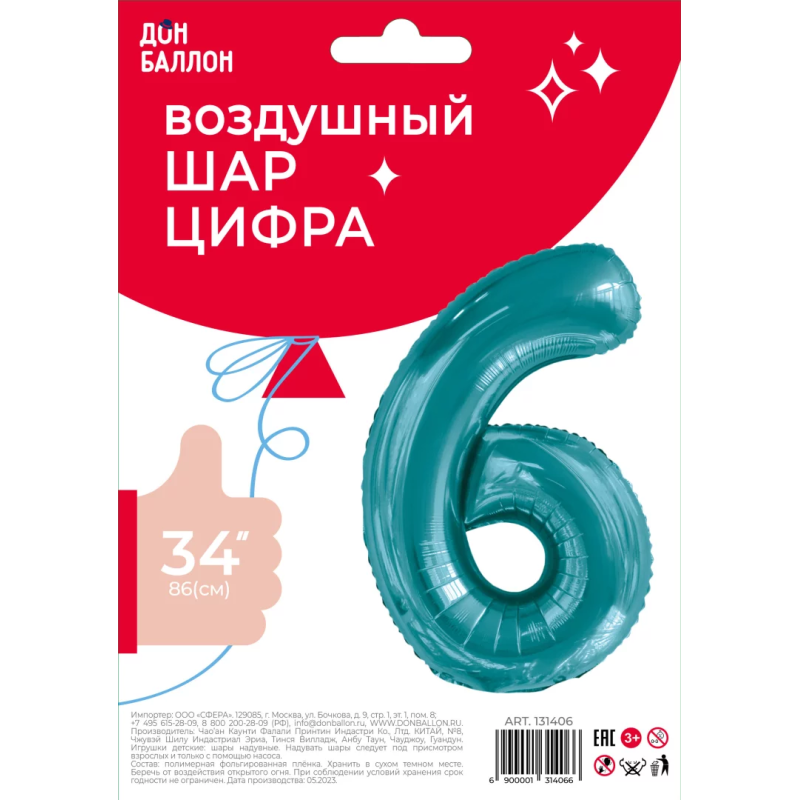 Шар (34''/86 см) Цифра, 6 Slim, Тиффани, 1 шт. в уп., 131406