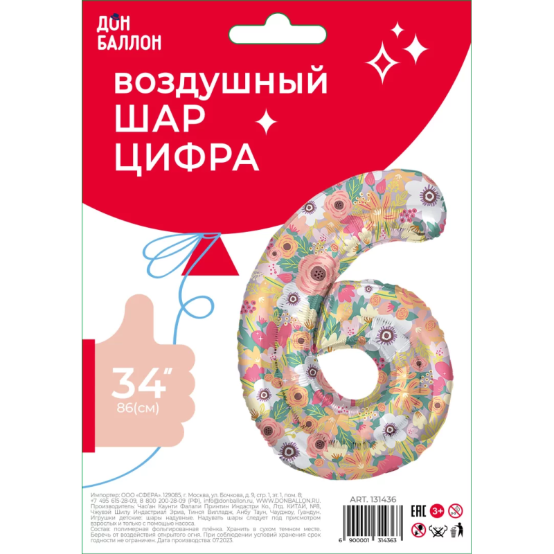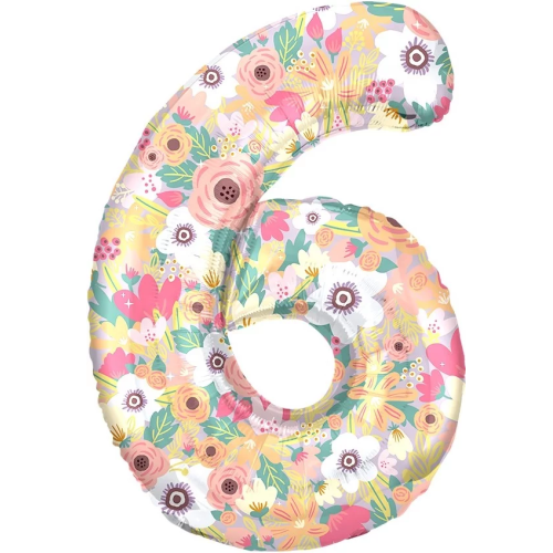 Шар (34''/86 см) Цифра, 6 Цветочный вальс, 1 шт. в уп., 131436