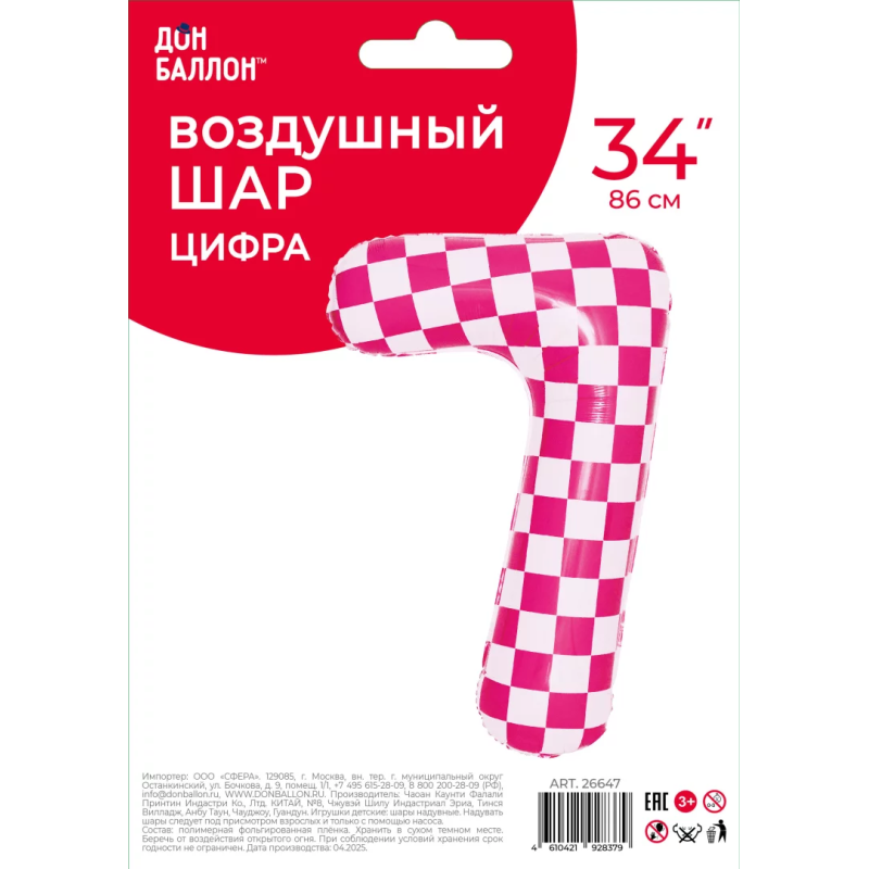 Шар (34''/86 см) Цифра, 7 Клеточки, Розовый/Фуше, 1 шт. в уп., 26647