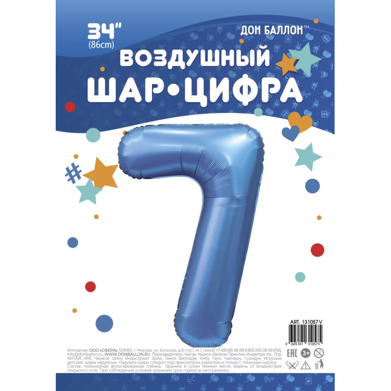 Шар (34''/86 см) Цифра, 7, Синий, Сатин, 1 шт. в уп., 131057V