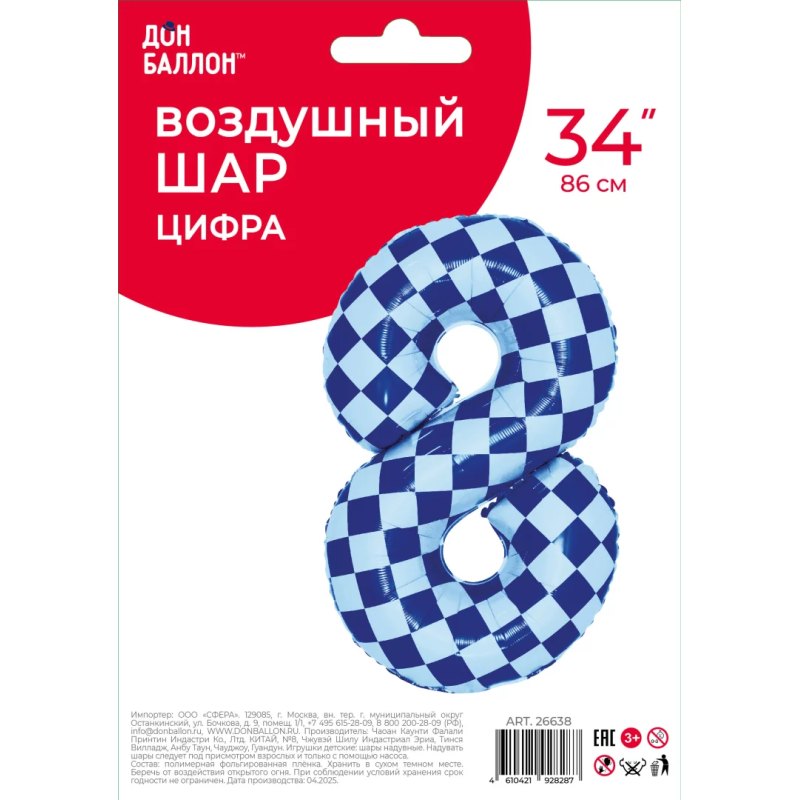 Шар (34''/86 см) Цифра, 8 Клеточки, Голубой/Синий, 1 шт. в уп., 26638