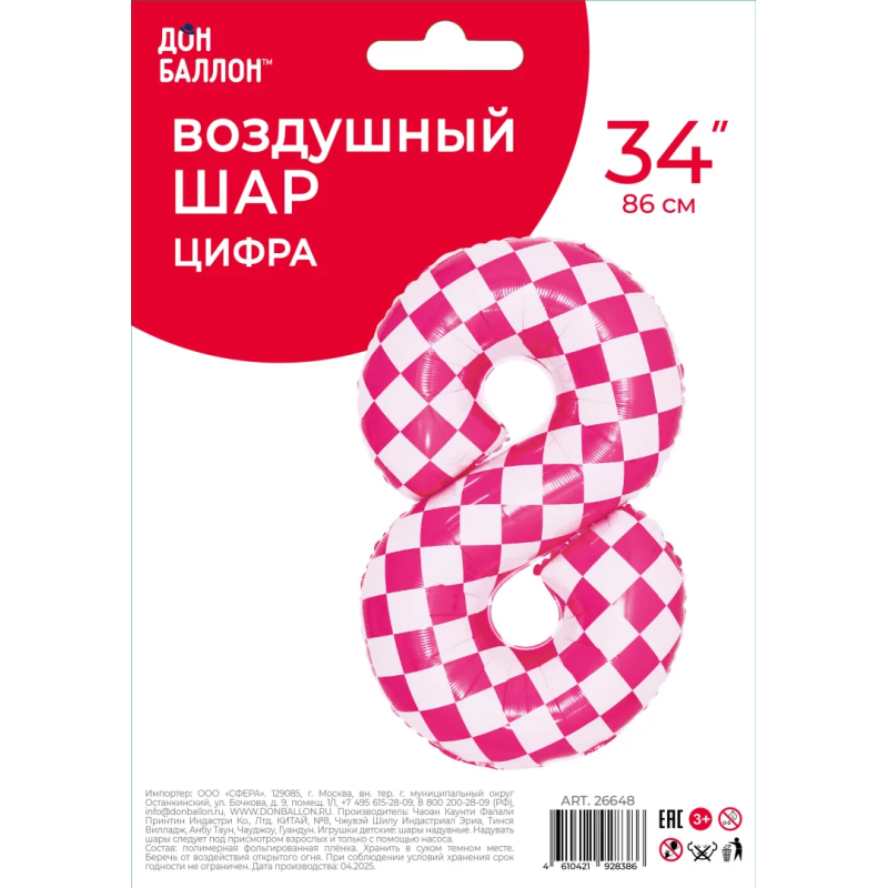Шар (34''/86 см) Цифра, 8 Клеточки, Розовый/Фуше, 1 шт. в уп., 26648