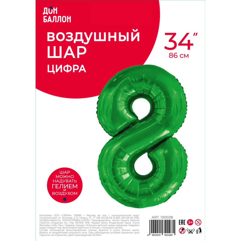 Шар (34''/86 см) Цифра, 8 Slim, Зеленый, 1 шт. в уп., 130028