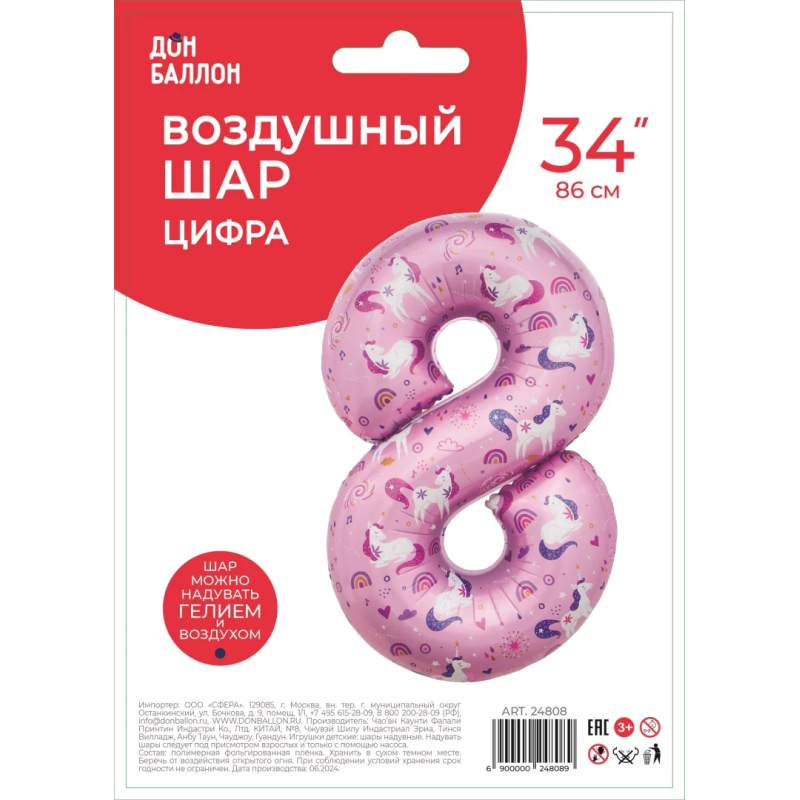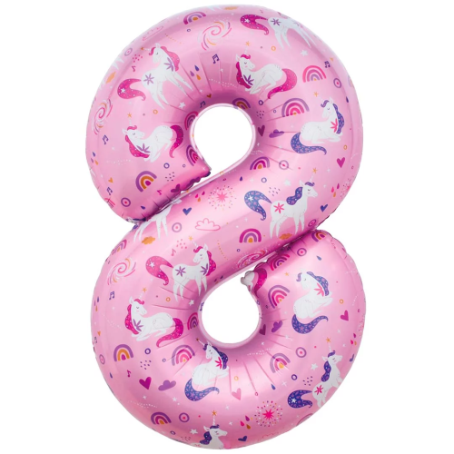 Шар (34''/86 см) Цифра, 8 Волшебные единороги, Розовый, 1 шт. в уп., 24808