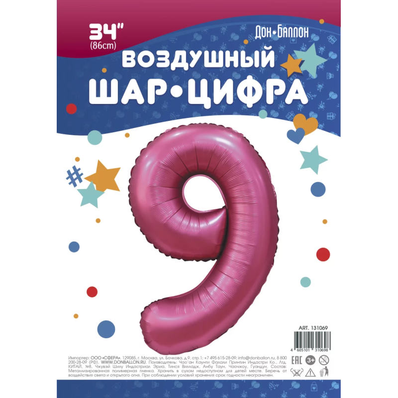 Шар (34''/86 см) Цифра, 9, Бордовый, Сатин, 1 шт. в уп., 131069V