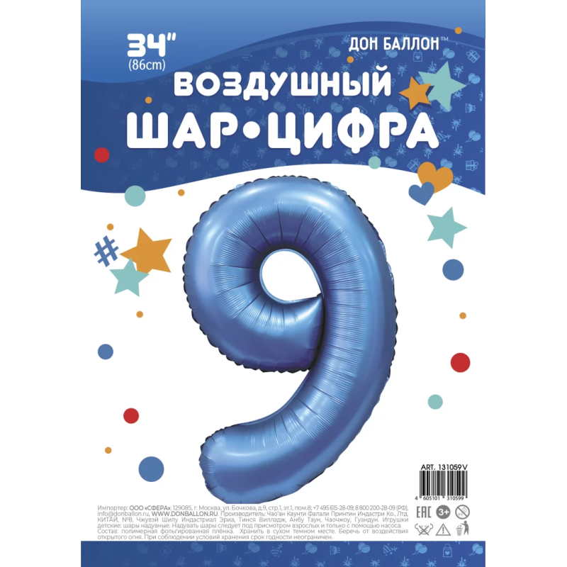 Шар (34''/86 см) Цифра, 9, Синий, Сатин, 1 шт. в уп., 131059V