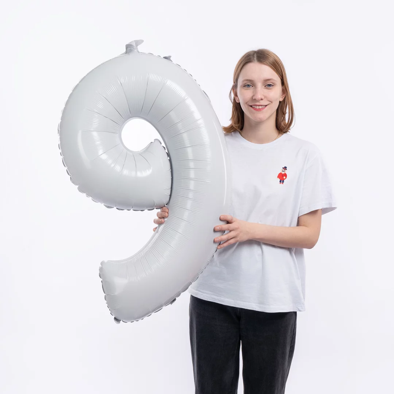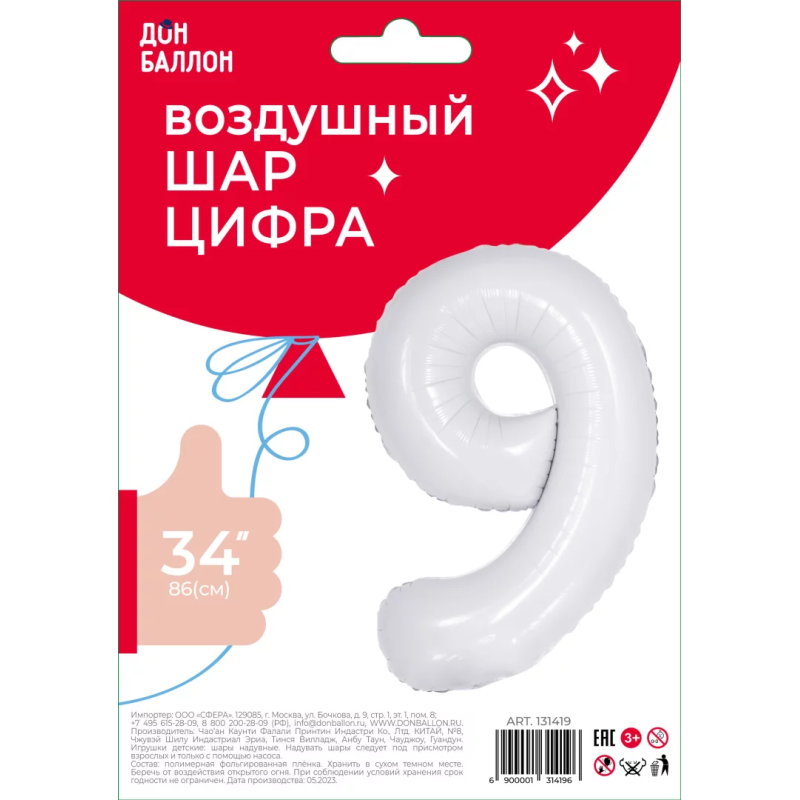 Шар (34''/86 см) Цифра, 9 Slim, Белый, 1 шт. в уп., 131419