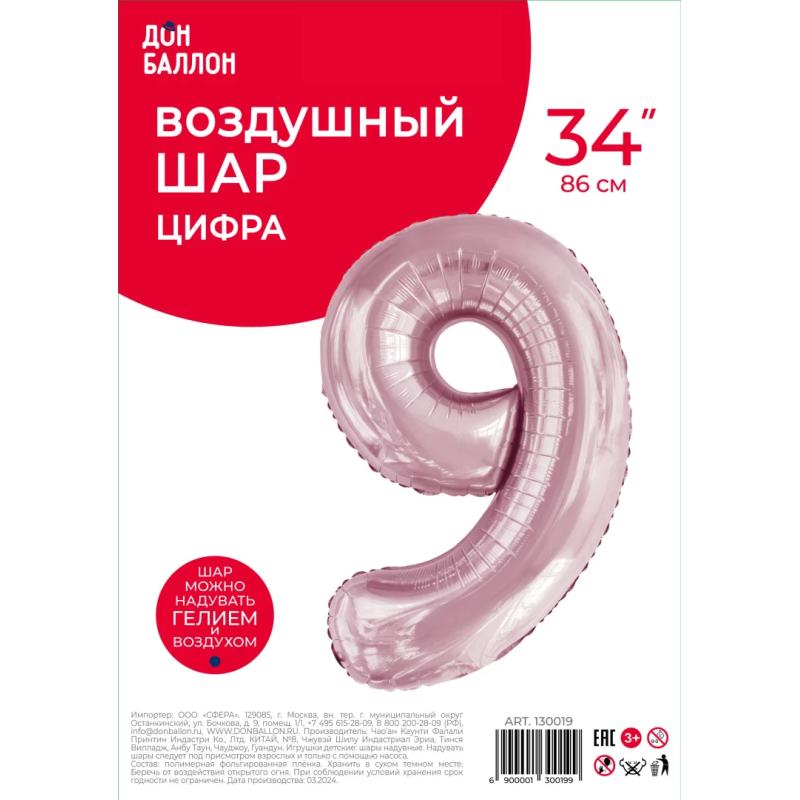 Шар (34''/86 см) Цифра, 9 Slim, Светло-розовый, 1 шт. в уп., 130019