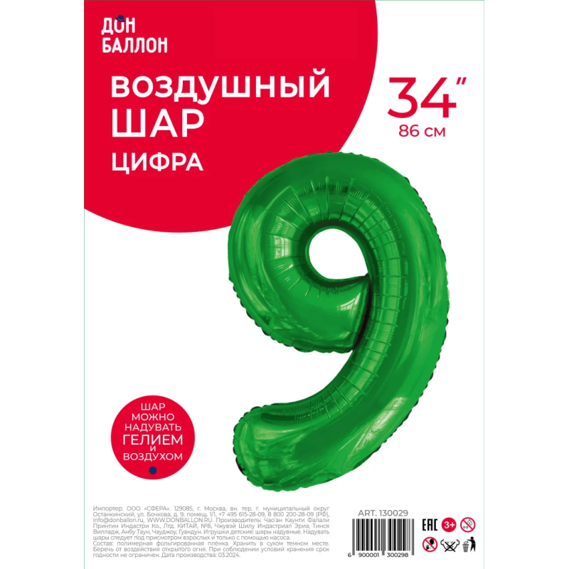 Шар (34''/86 см) Цифра, 9 Slim, Зеленый, 1 шт. в уп., 130029