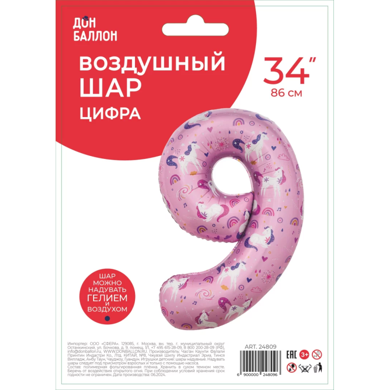 Шар (34''/86 см) Цифра, 9 Волшебные единороги, Розовый, 1 шт. в уп., 24809