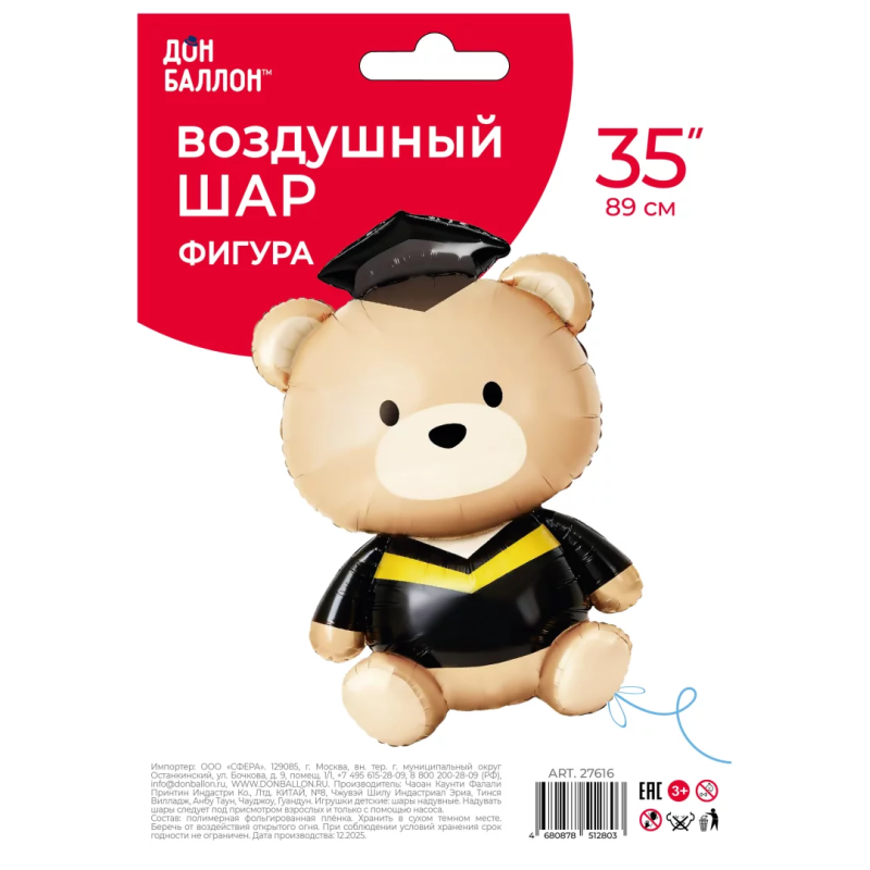 Шар (35''/89 см) Фигура, Медвежонок Выпускник, 1 шт. в уп., 27616