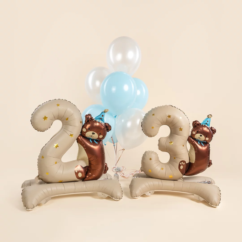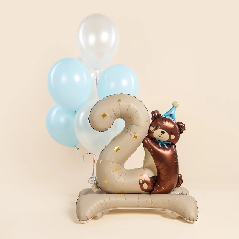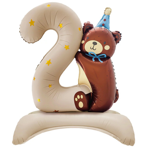 Шар (35''/89 см) Цифра на подставке, 2 Годика, Мишка в голубом колпачке, Бежевый, Сатин, 1 шт. в уп., 27302B