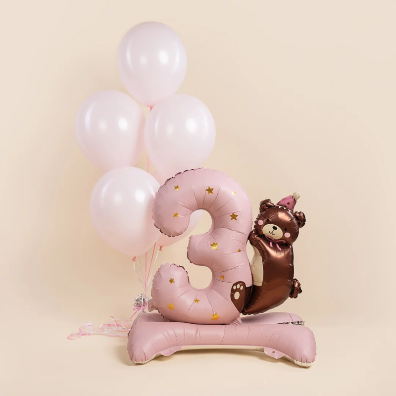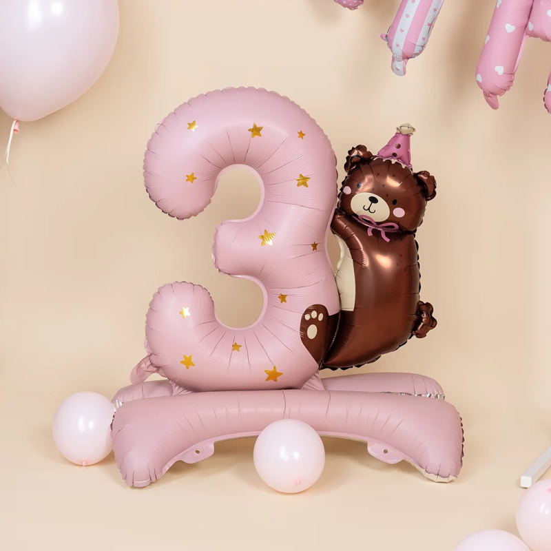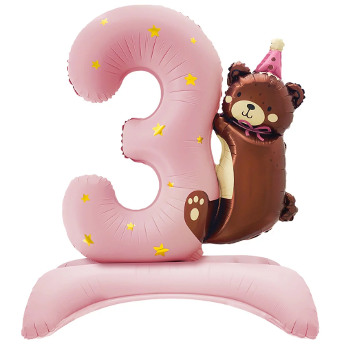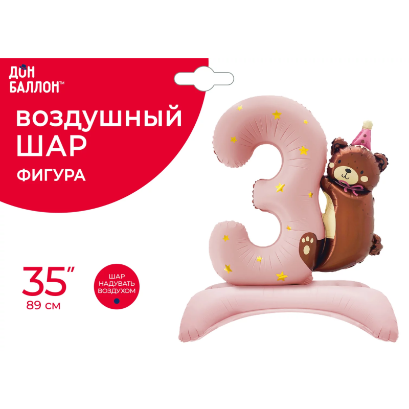 Шар (35''/89 см) Цифра на подставке, 3 Годика, Мишка в колпачке, Розовый, Сатин, 1 шт. в уп., 267563P