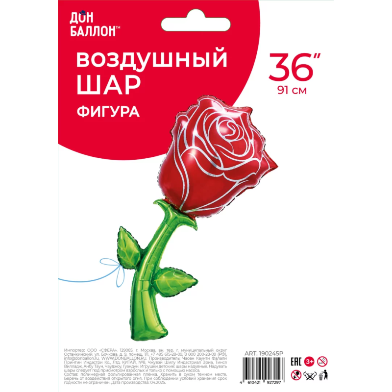 Шар (36''/91 см) Цветок, Роза, Красный, 1 шт. в уп., 190245P