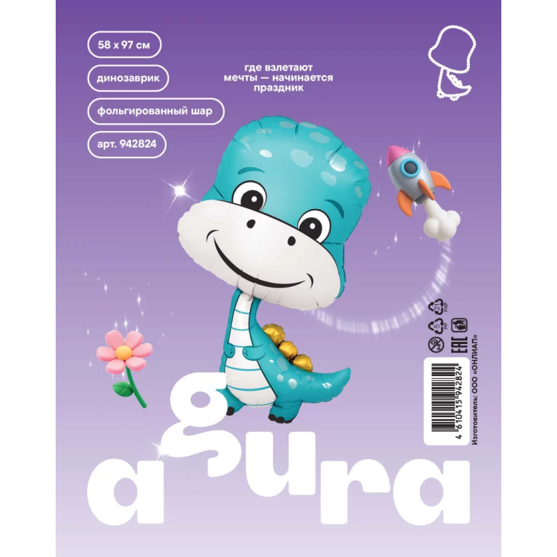 Шар (38''/97 см) Фигура, Динозаврик, 1 шт. в уп., 942824
