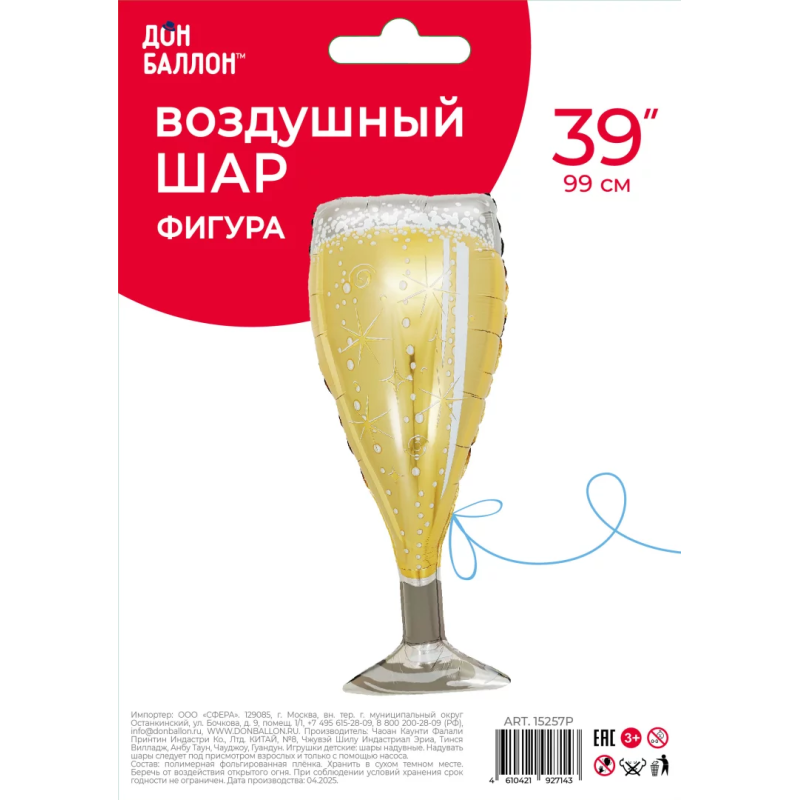 Шар (39''/99 см) Фигура, Бокал, Искрящееся Шампанское, 1 шт. в уп., 15257P