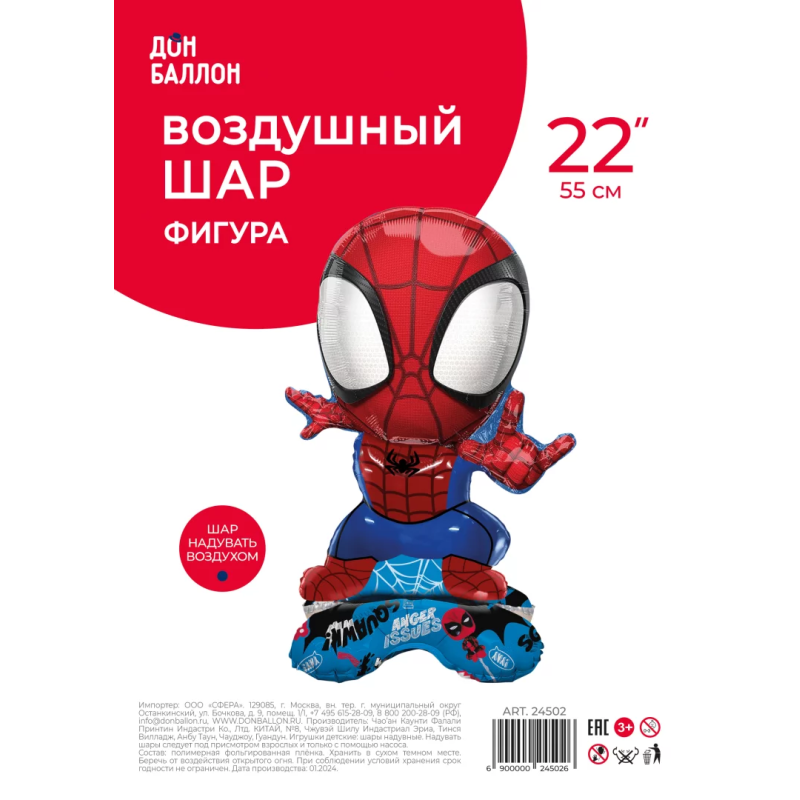 Шар 3D (22''/56 см) Фигура на подставке, Человек Паук, 1 шт. в уп., 24502