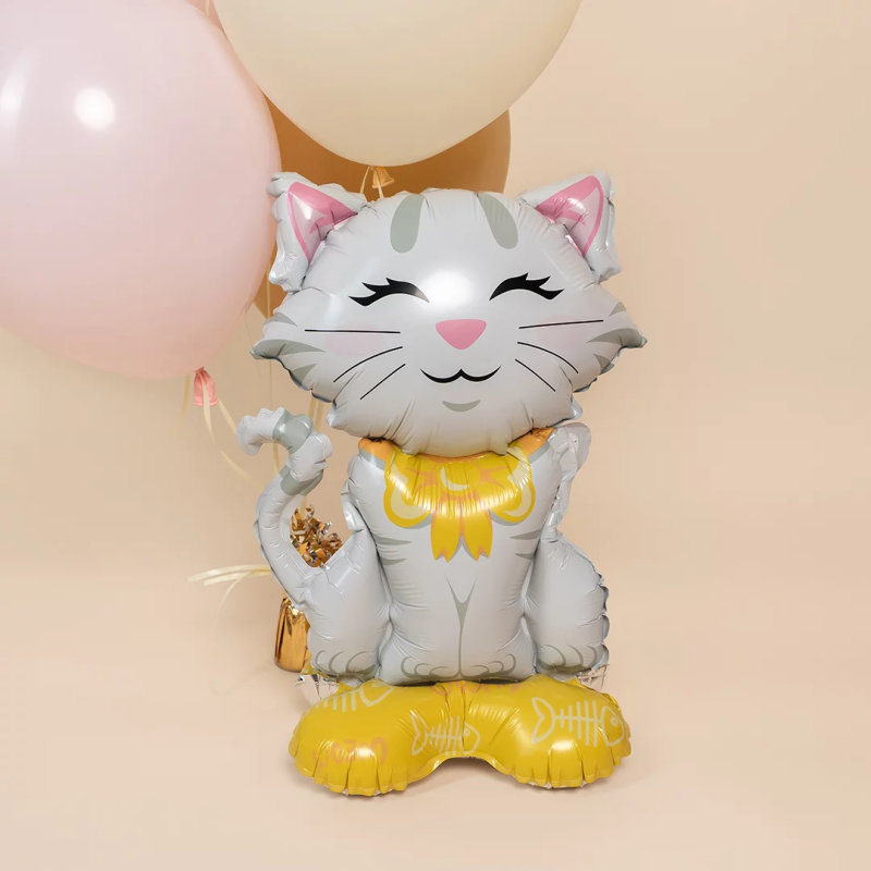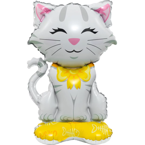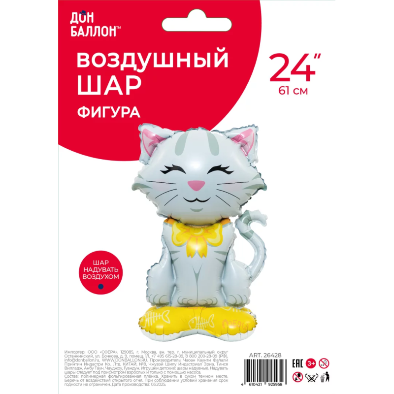 Шар 3D (24''/61 см) Фигура на подставке, Кошечка с бантиком, Белый, 1 шт. в уп., 26428