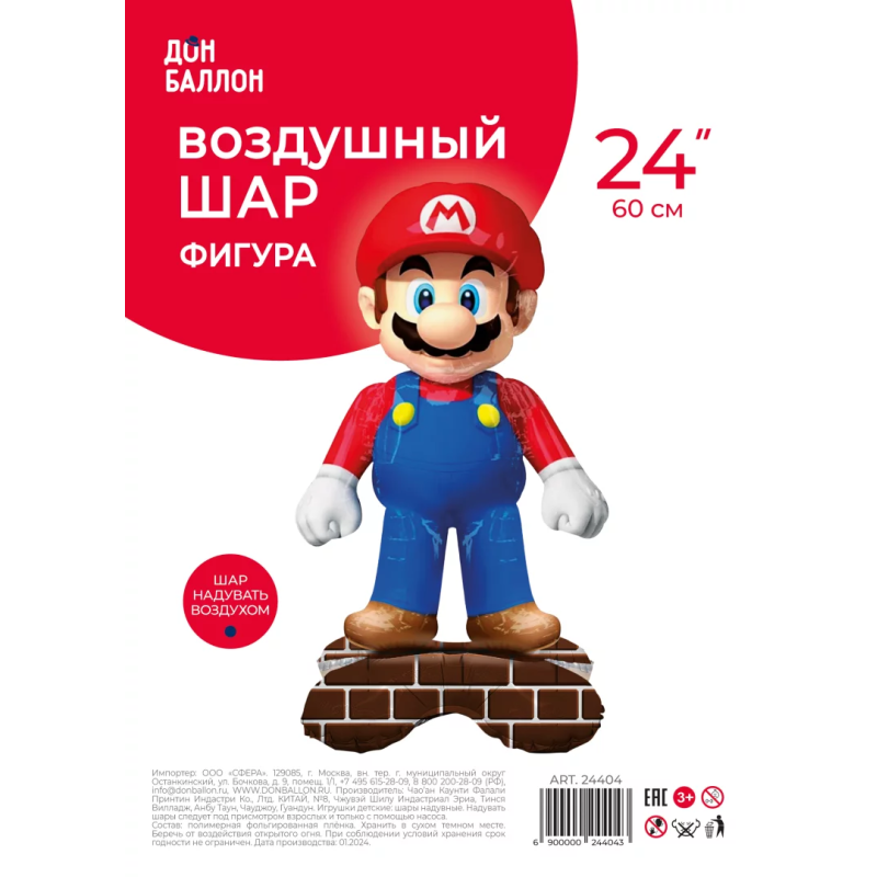 Шар 3D (24''/61 см) Фигура на подставке, Водопроводчик Марио, 1 шт. в уп., 24404