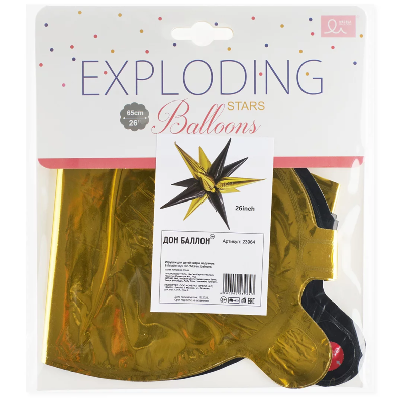 Шар 3D (26''/66 см) Звезда, Составная, Черный/Золото, 1 шт. в уп., 23964