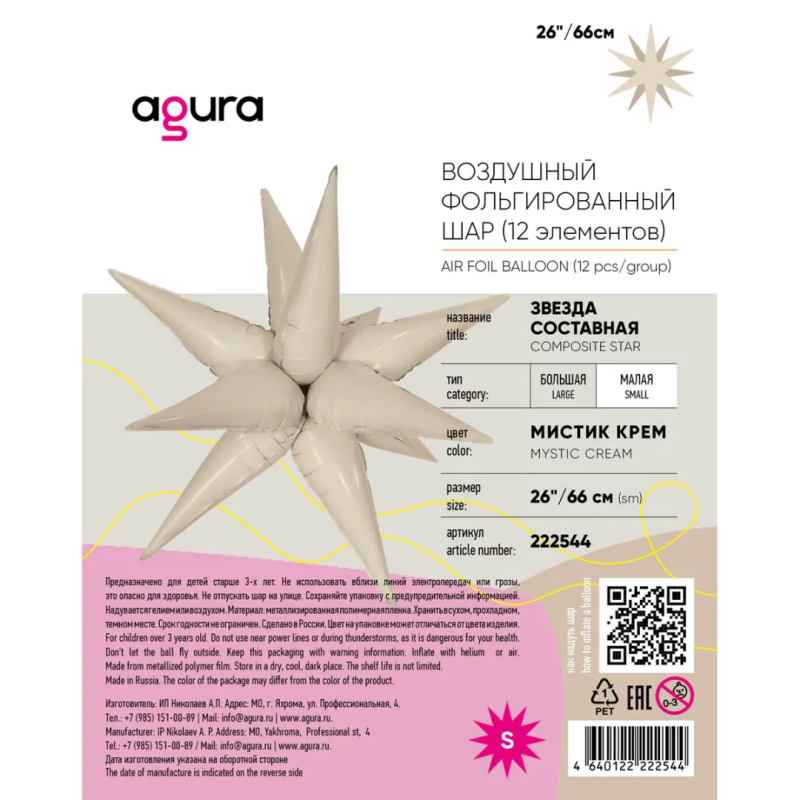 Шар 3D (26''/66 см) Звезда, Составная, Мистик, Кремовый, Сатин, 1 шт. в уп., 222544