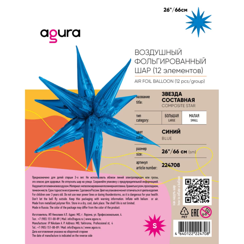 Шар 3D (26''/66 см) Звезда, Составная, Синий, 1 шт. в уп., 224708