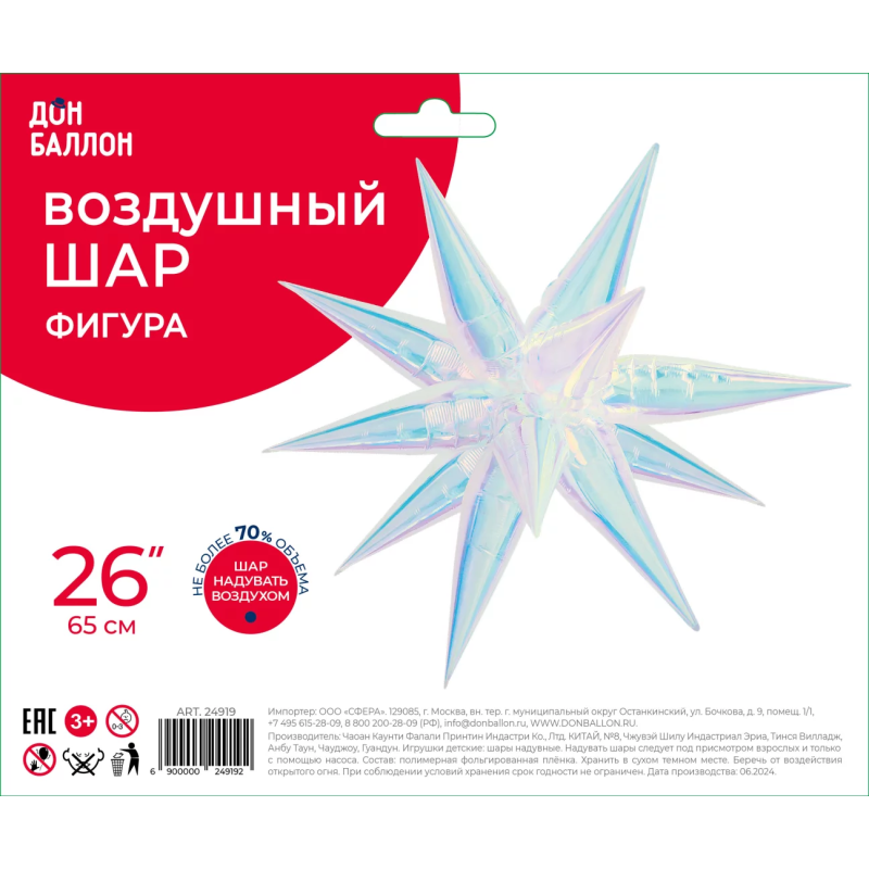 Фигура звезды предназначена для надува воздухом и состоит из 12 отдельных элементов со встроенным клапаном, которые после надува собираются в одну объемную фигуру.