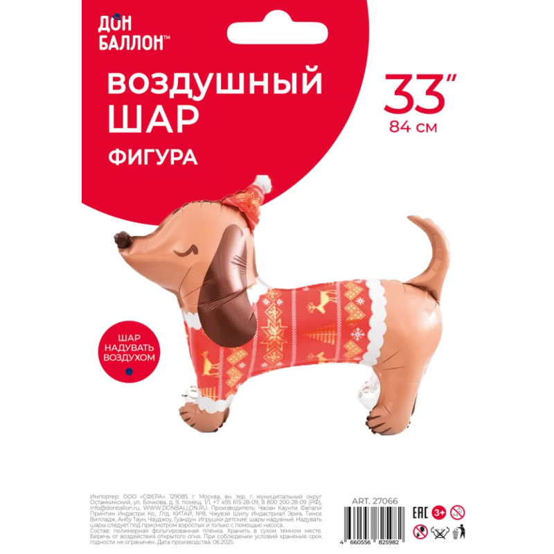 Шар 3D (33''/84 см) Новогодний таксик, 1 шт. в уп., 27066