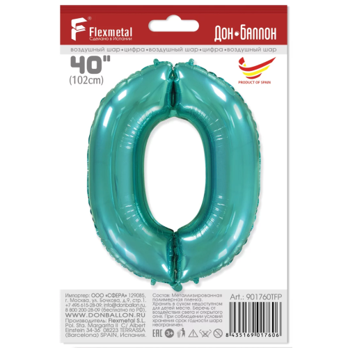 Шар (40''/102 см) Цифра, 0, Тиффани, 1 шт. в уп., 901760TFP
