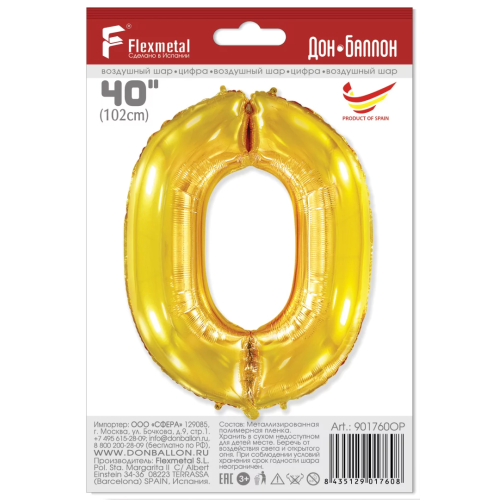Шар (40''/102 см) Цифра, 0, Золото, 1 шт. в уп., 901760OP