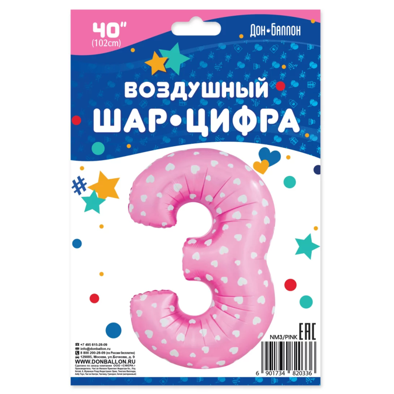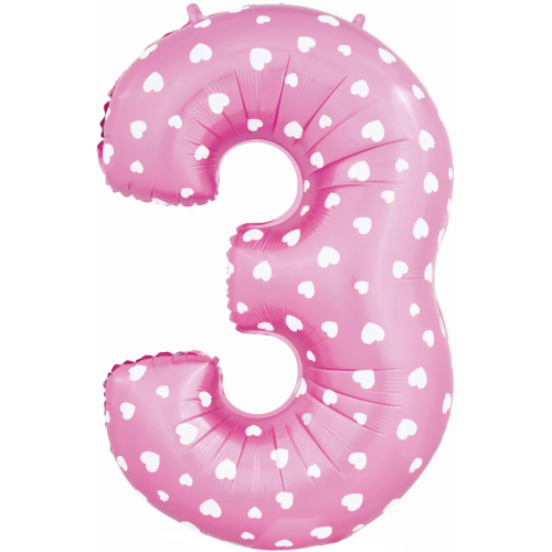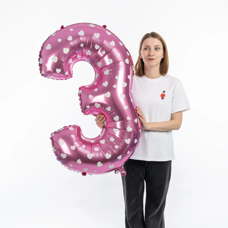 Шар (40''/102 см) Цифра, 3 Сердечки, Розовый, 1 шт. в уп., NMP3/PINK/V