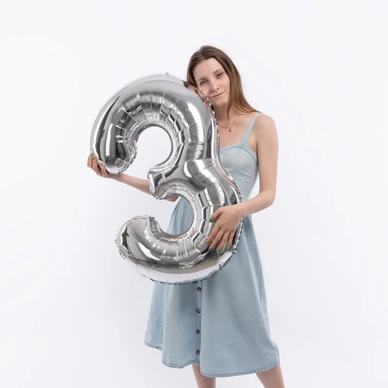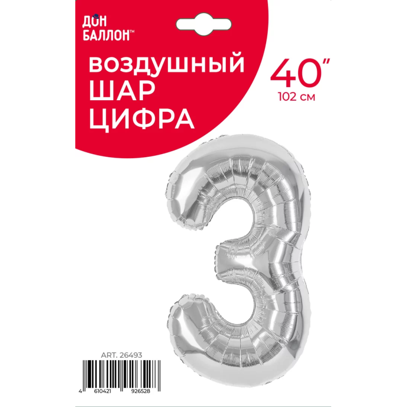 Шар (40''/102 см) Цифра, 3, Серебро, Металлик, 1 шт. в уп., 26493